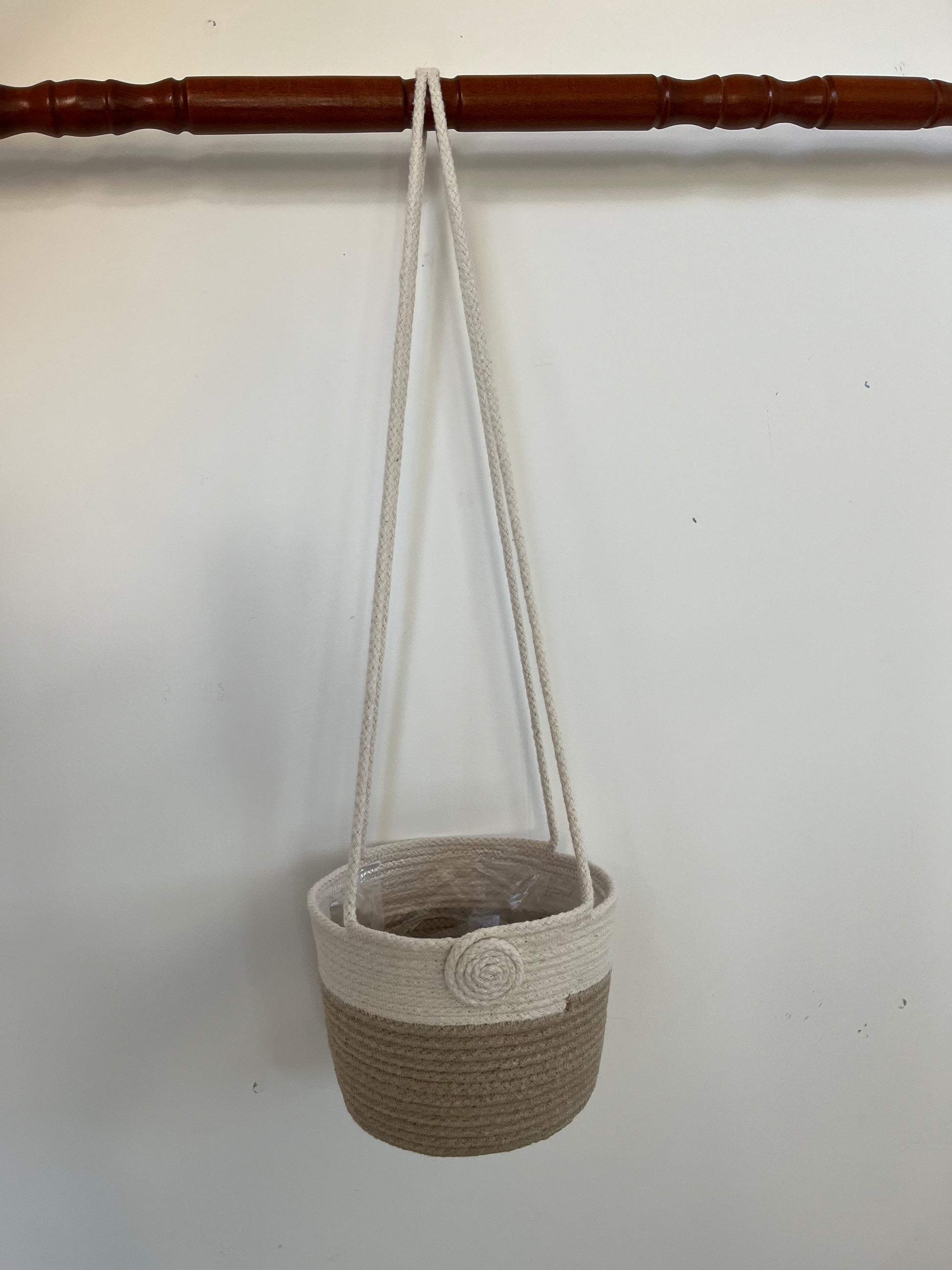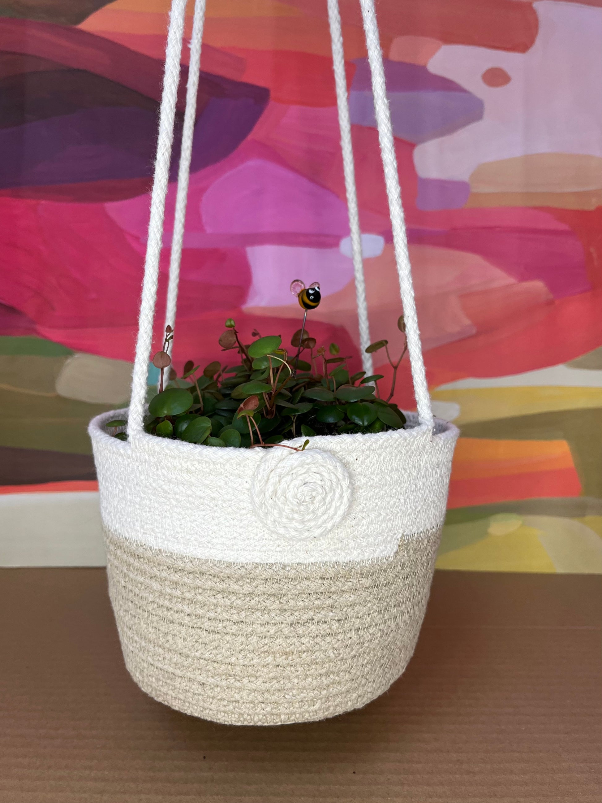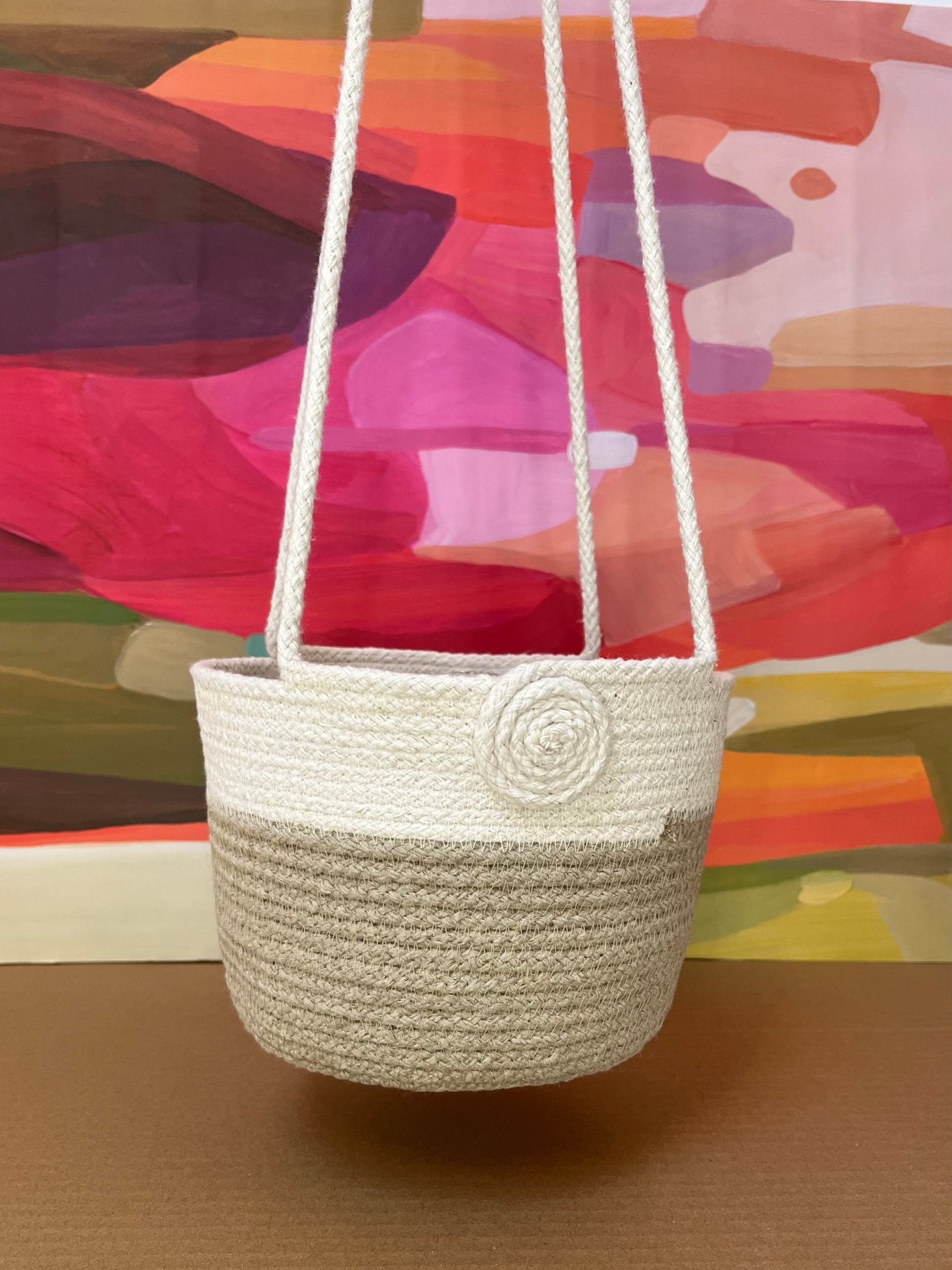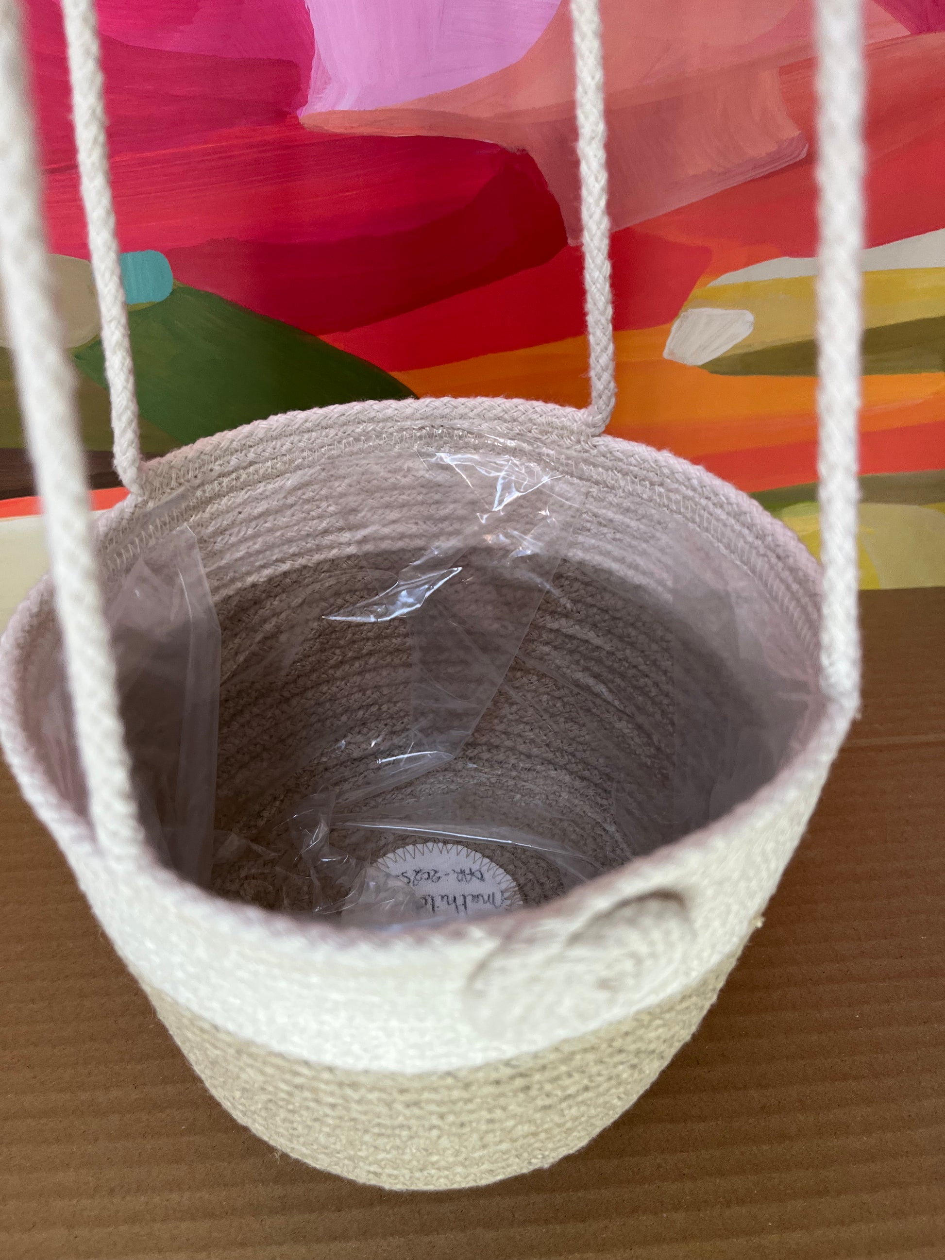 Clementine is a basket made of flax rope, cotton rope and a lining made of plastic I am up cycling.