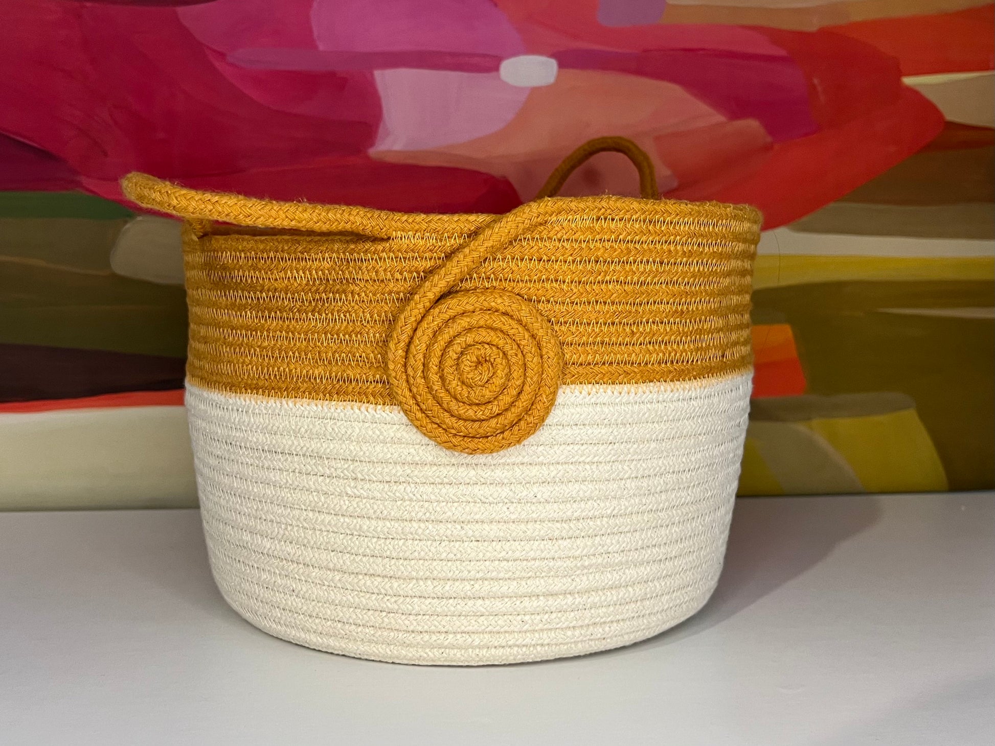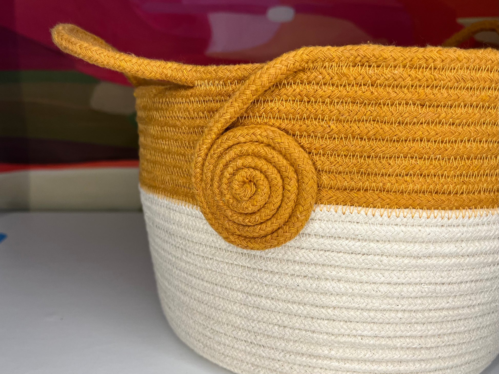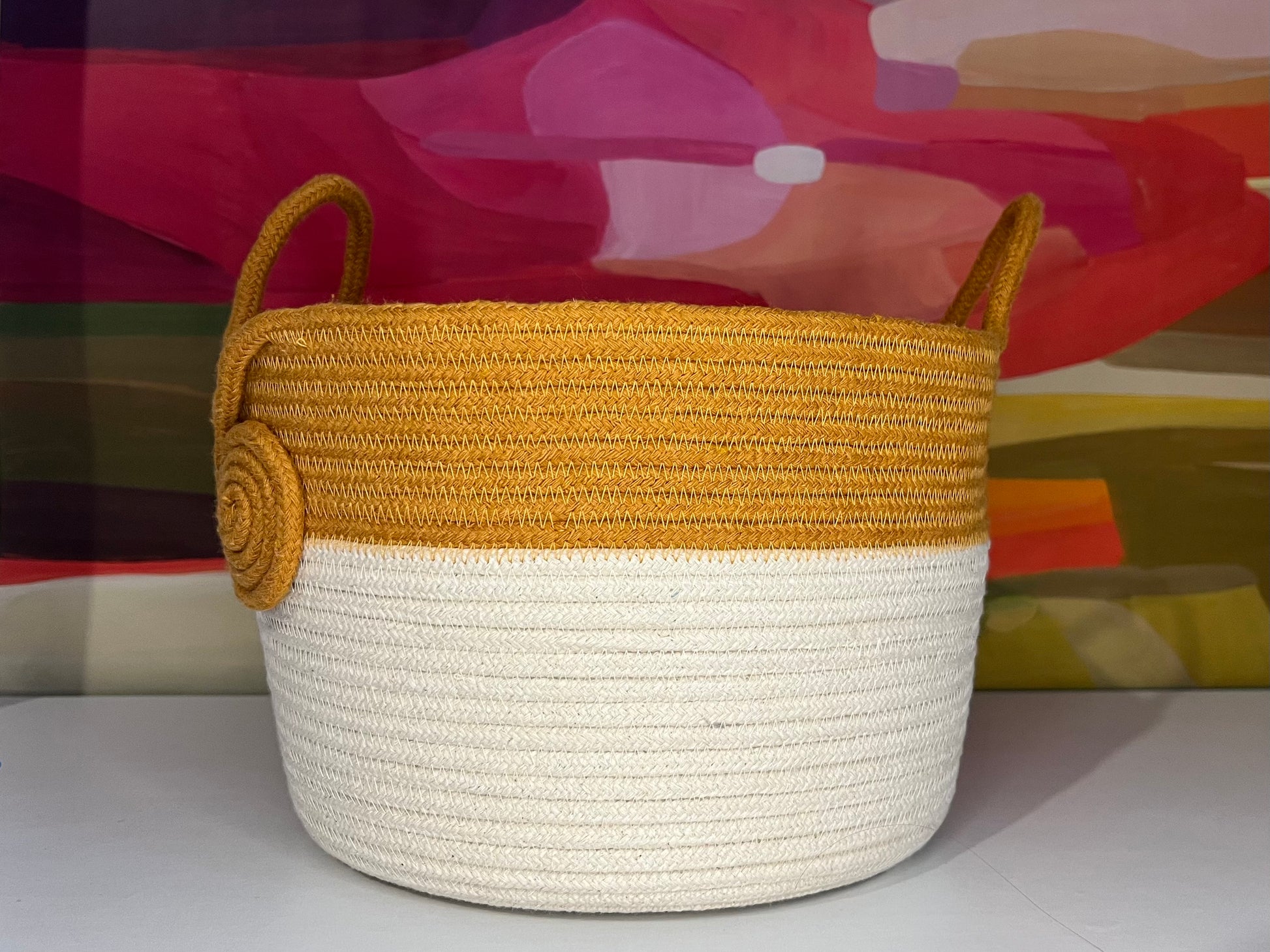 Every basket are unique and handmade by me in my studio in the Outer Hebrides. I use cotton rope made in England. Due to the handmade work, the diameter and the high can vary.