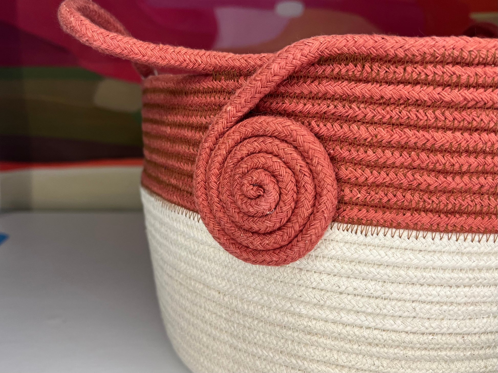 Every basket are unique and handmade by me in my studio in the Outer Hebrides. I use cotton rope made in England. Due to the handmade work, the diameter and the high can vary.