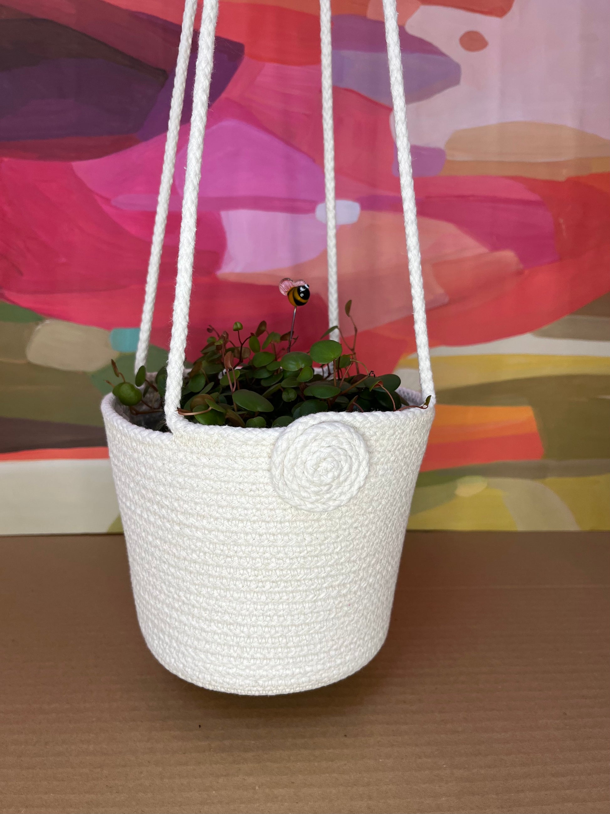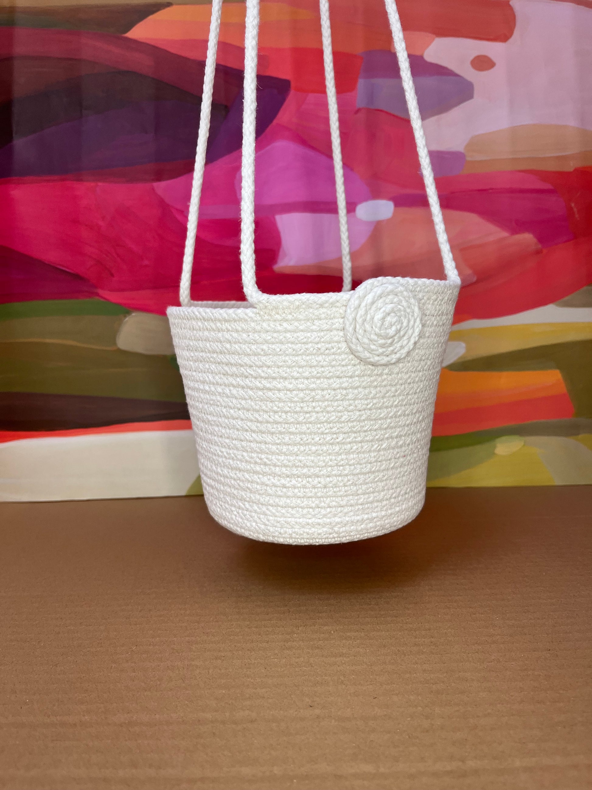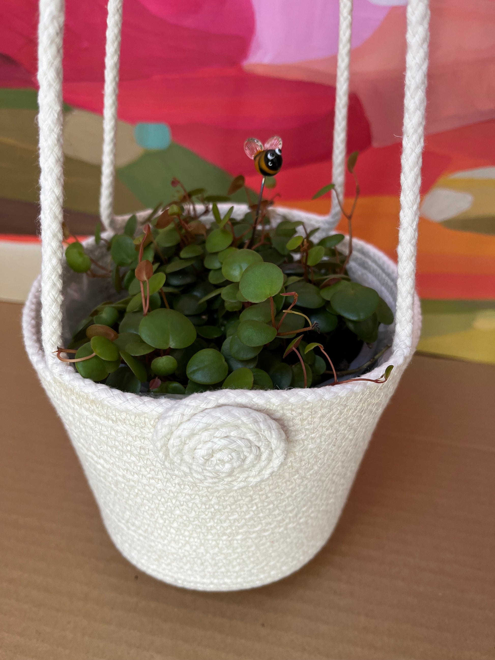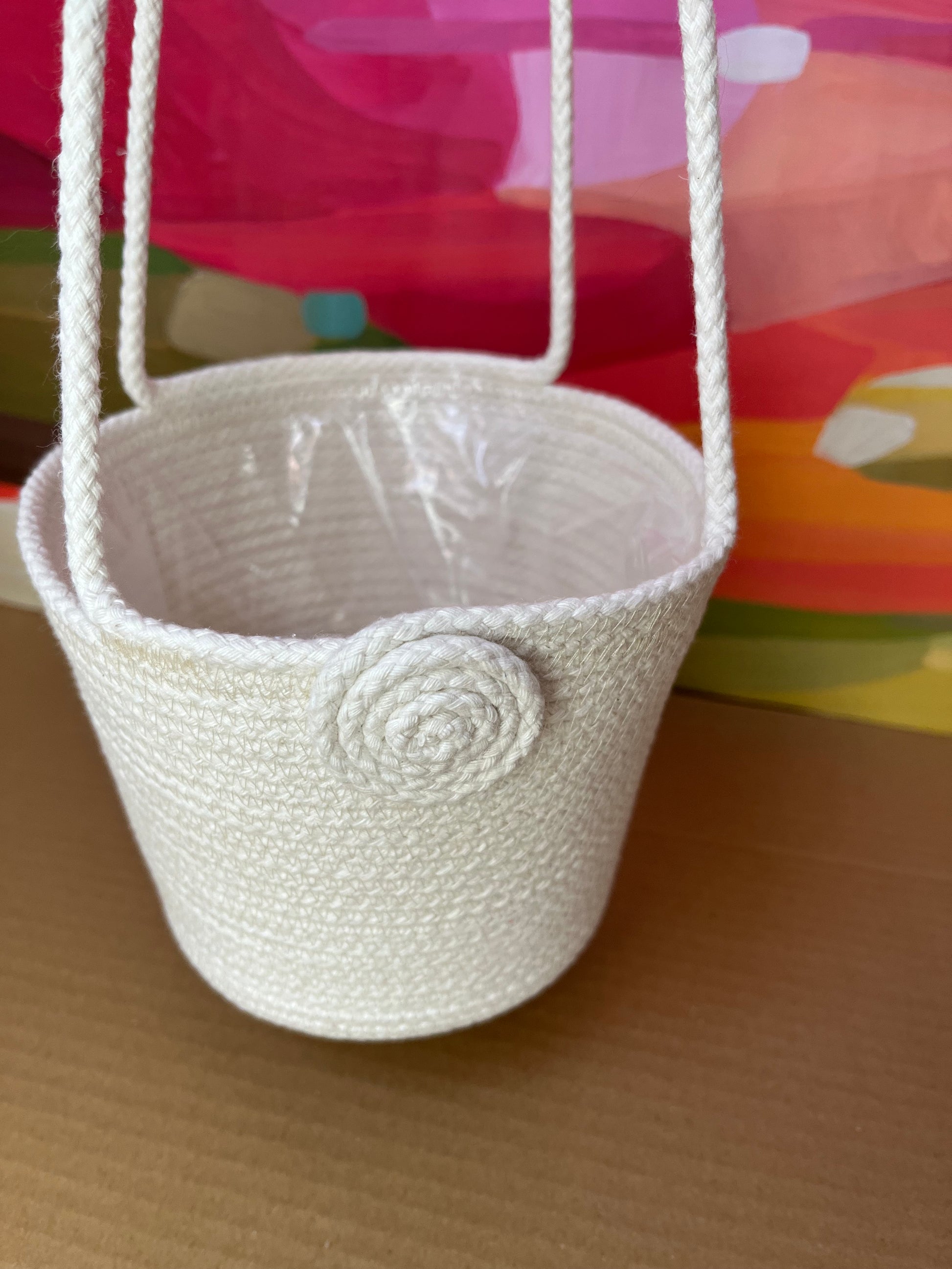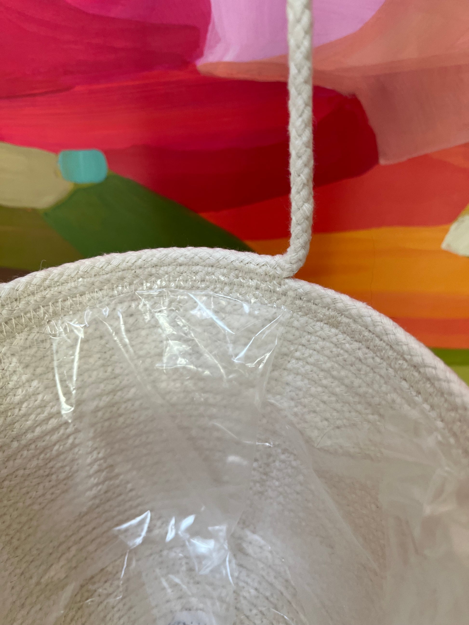 Mandarine is a basket made of cotton rope and a lining made of plastic I am up cycling.